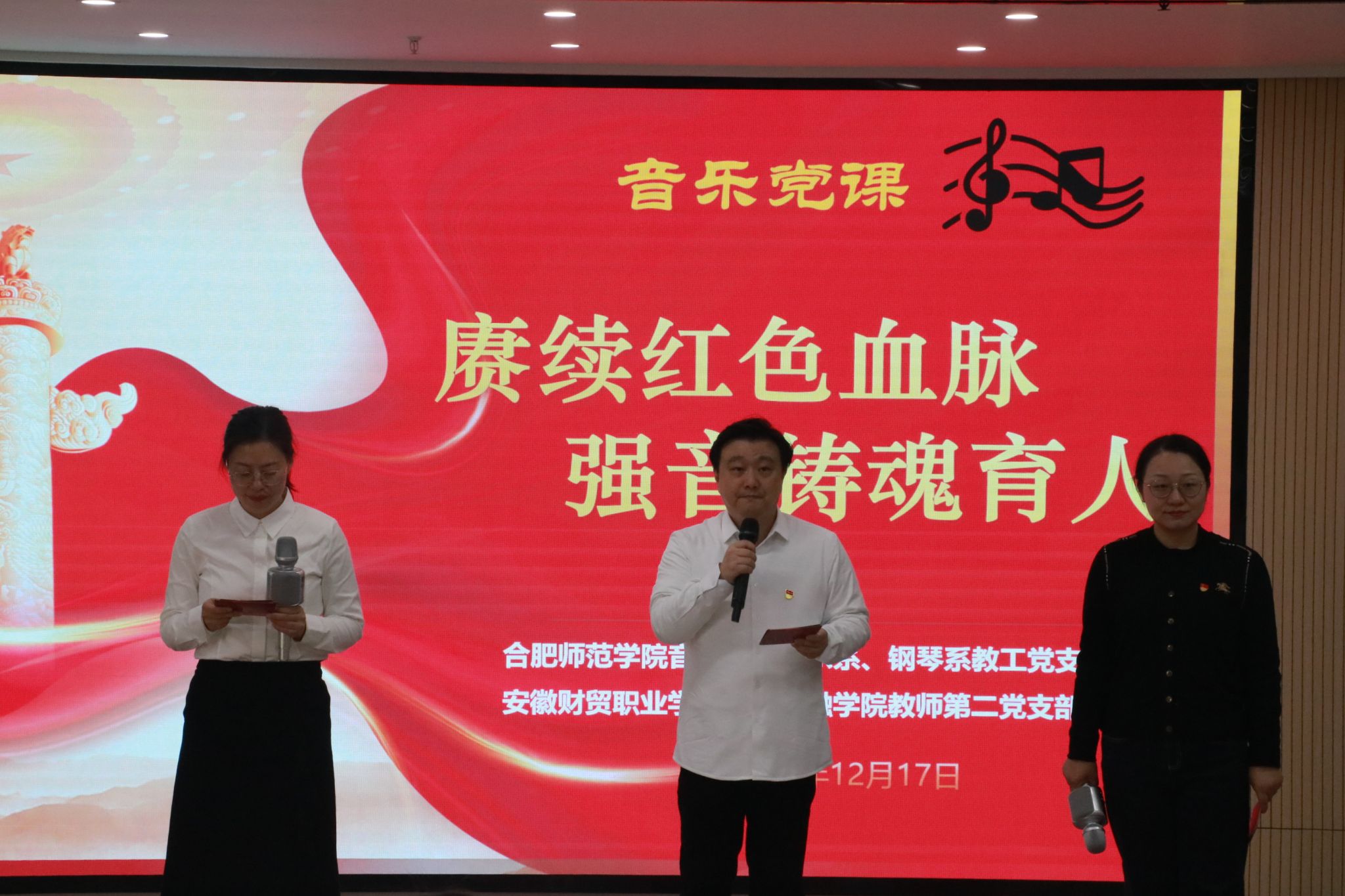 2025年12月17日,由welcome皇冠地址声乐系、钢琴系教工党支部与安徽财贸职业学院财会金融学院教师第二党支部以党建联建的形式,共同开启了以“赓续红色血脉,强音铸魂育人”为主题,纪念中国人民抗日战争胜利80周年的音乐党课在安徽财贸职业学院顺利开展。省供销社一级巡视员魏邦余、安徽财贸职业学院党委书记张志祥、省供销社机关党委专职副书记陈雷等领导出席本次活动。
